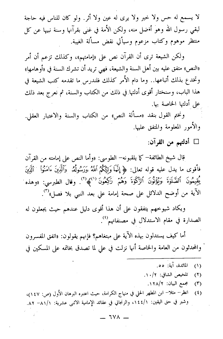 ولكن الشيعة ترى أن القرآن نص على "إمامتهم"، وكذلك تزعم أن أمر "النص" متفق عليه بين أهل السنة والشيعة، فهي تريد أن تشرك السنة في "أوهامها" وتخدع بذلك أتباعها.. وما دام الأمر كذلك فلندرس ما تقدمه كتب الشيعة في هذا الباب، وسنختار أقوى أدلتها في ذلك من الكتاب والسنة، ثم نعرج بعد ذلك على أدلتها الخاصة بها.