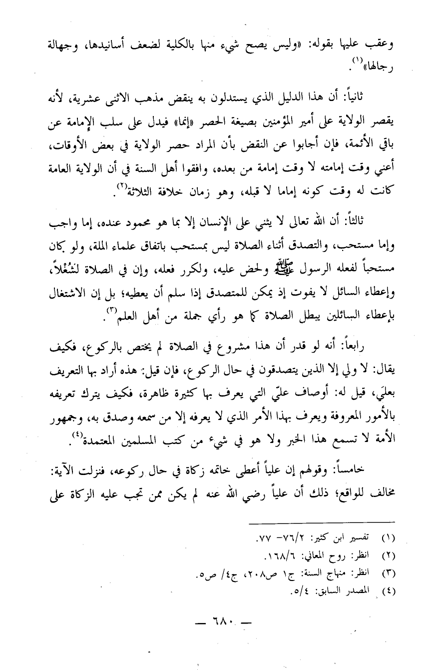 ثانياً: أن هذا الدليل الذب يستدلون به ينقض مذهب الاثني عشرية؛ لأنه يقصر الولاية على أمير المؤمنين بصيغة الحصر "إنما" فيدل على سلب الإمامة عن باقي الأئمة، فإن أجابوا عن النقض بأن المراد حصر الآية في بعض الأوقات، أعني وقت إمامته لا وقت إمامة من بعده، وافقوا أهل السنة في أن الولاية العامة كانت له وقت كونه إمامًأ لا قبله، وهو زمان خلافة الثلاثة (¬2) .