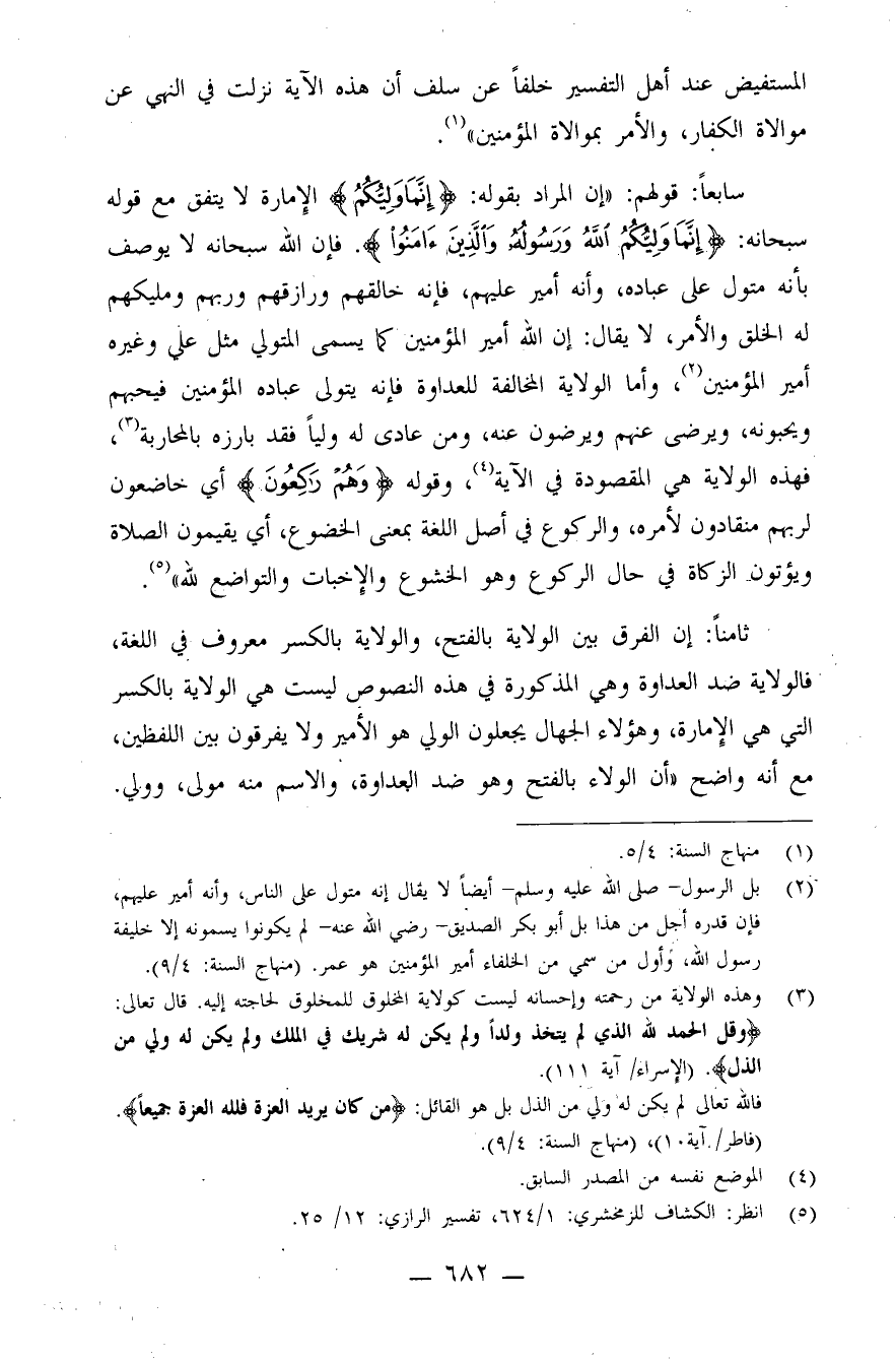 سابعًا: قولهم: "إن المراد بقوله: {إِنَّمَا وَلِيُّكُمُ} الإمارة - لا يتفق مع قوله سبحانه: {إِنَّمَا وَلِيُّكُمُ اللهُ وَرَسُولُهُ وَالَّذِينَ آمَنُواْ} ؛ فإن الله سبحانه لا يوصف بأنه متول على عباده، وأنه أمير عليهم، فإنه خالقهم ورازقهم وربهم ومليكهم له الخلق والأمر، لا يقال: إن الله أمير المؤمنين كما يسمى المتولي مثل علي وغيره أمير المؤمنين (¬2) ، وأما الولاية المخالفة للعداوة فإنه يتولى عباده المؤمنين فيحبهم ويحبونه، ويرضى عنهم ويرضون عنه، ومن عادى له وليًا فقد بارزه بالمحاربة (¬3) .
