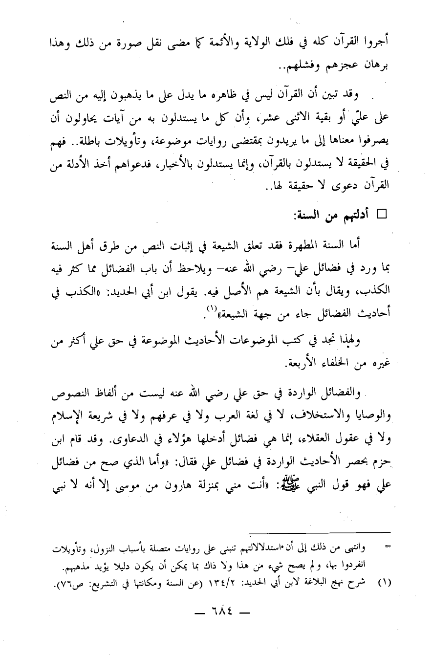 وقد تبين أن القرآن ليس في ظاهره ما يدل على ما يذهبون إليه من النص على عليّ أو بقية الاثني عشر، وأن كل ما يستدلون به من آيات يحاولون أن يصرفوا معناها إلى ما يريدون بمقتضى روايات موضوعة، وتأويلات باطلة.. فهم في الحقيقة لا يستدلون بالقرآن، وإنما يستدلون بالأخبار، فدعواهم أخذ الأدلة من القرآن دعوى لا حقيقة لها.
