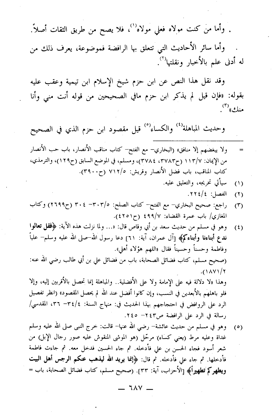 (¬4) وهو في مسلم من حديث سعد بن أبي وقاص قال: « ... ولما نزلت هذه الآية: {فَقُلْ تَعَالَوْاْ نَدْعُ أَبْنَاءنَا وَأَبْنَاءكُمْ} ... آل عمران، آية: 61 ... دعا رسول الله صلى الله عليه وسلم عليًا وفاطمة وحسنًا وحسينًا فقال: "اللهم هؤلاء أهلي" ".