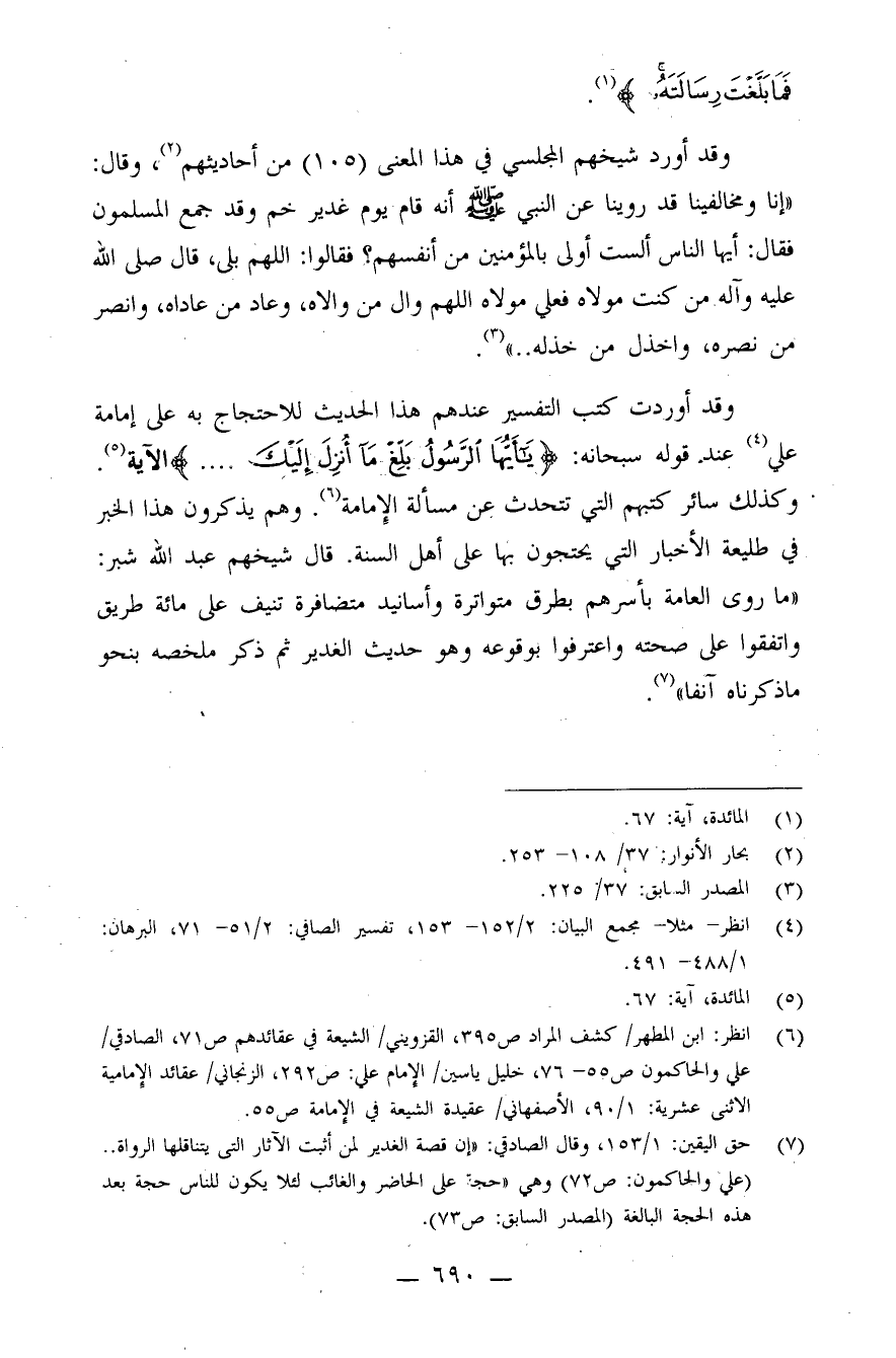 (¬7) حق اليقين: 1/153، وقال الصادقي: "إن قصة الغدير لمن أثبت الآثار التي يتناقلها الرواة.." (علي والحاكمون: ص72) وهي "حجة على الحاضر والغائب لئلا يكون للناس حجة بعد هذه الحجة البالغة" (علي والحاكمون: ص73)