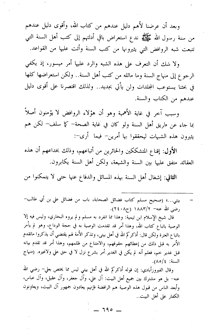ولا شك أن التعرف على هذه الشبه والرد عليها أمر ميسور، إذ يكفي الرجوع إلى منهاج السنة وما ماثله من كتب أهل السنة.. ولكن استعراضها كلها في بحثنا يستوعب المجلدات ولن يأتي بجديد.. ولذلك اقتصرنا على أقوى دليل عندهم من الكتاب والسنة.
