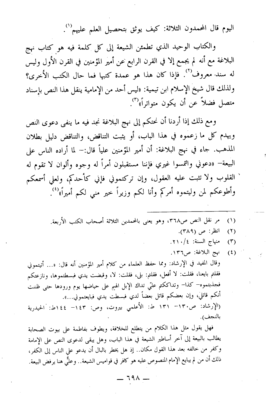 والكتاب الوحيد الذي تطمئن الشيعة إلى كل كلمة فيه هو كتاب نهج البلاغة مع أنه لم يجمع إلا في القرن الرابع عن أمير المؤمنين في القرن الأول وليس له سند معروف (¬2) . فإذا كان هذا هو عمدة كتبه فما حال الكتب الأخرى؟ ولذلك قال شيخ الإسلام ابن تيمية: "ليس أحد من الإمامية ينقل هذا النص بإسناد متصل فضلاً عن أن يكون متواترًا" (¬3) .