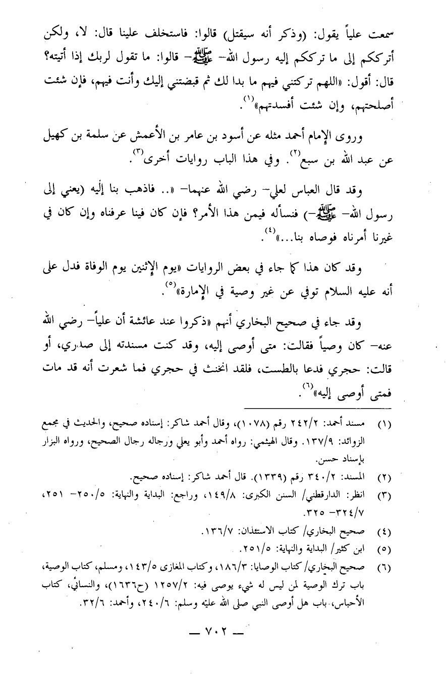 (¬6) صحيح البخاري/ كتاب الوصايا: 3/186، وكتاب المغازي 5/143، ومسلم، كتاب الوصيّة، باب ترك الوصيّة لِمَن ليس له شيء يُوصي فيه: 2/1257 (ح1636) ، والنّسائي، كتاب الأحباس، باب هل أوصى النّبيّ صلى الله عليه وسلم: 6/240، وأحمد: 6/32