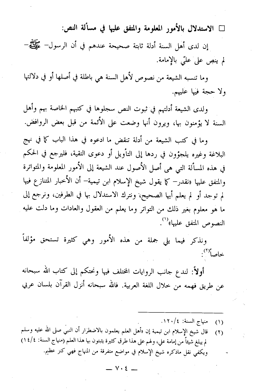 (¬1) قال شيخ الإسلام ابن تيمية: "إن أهل العلم يعلمون بالاضطرار أن النبي صلى الله عليه وسلم لم يبلغ شيئًا من إمامة علي، ولهم على هذا طرق كثيرة يثبتون بها هذا العلم" (منهاج السنة: 4/14) ويكفي نقل ما ذكره شيخ الإسلام في مواضع متفرقة من المنهاج فهي كنز عظيم