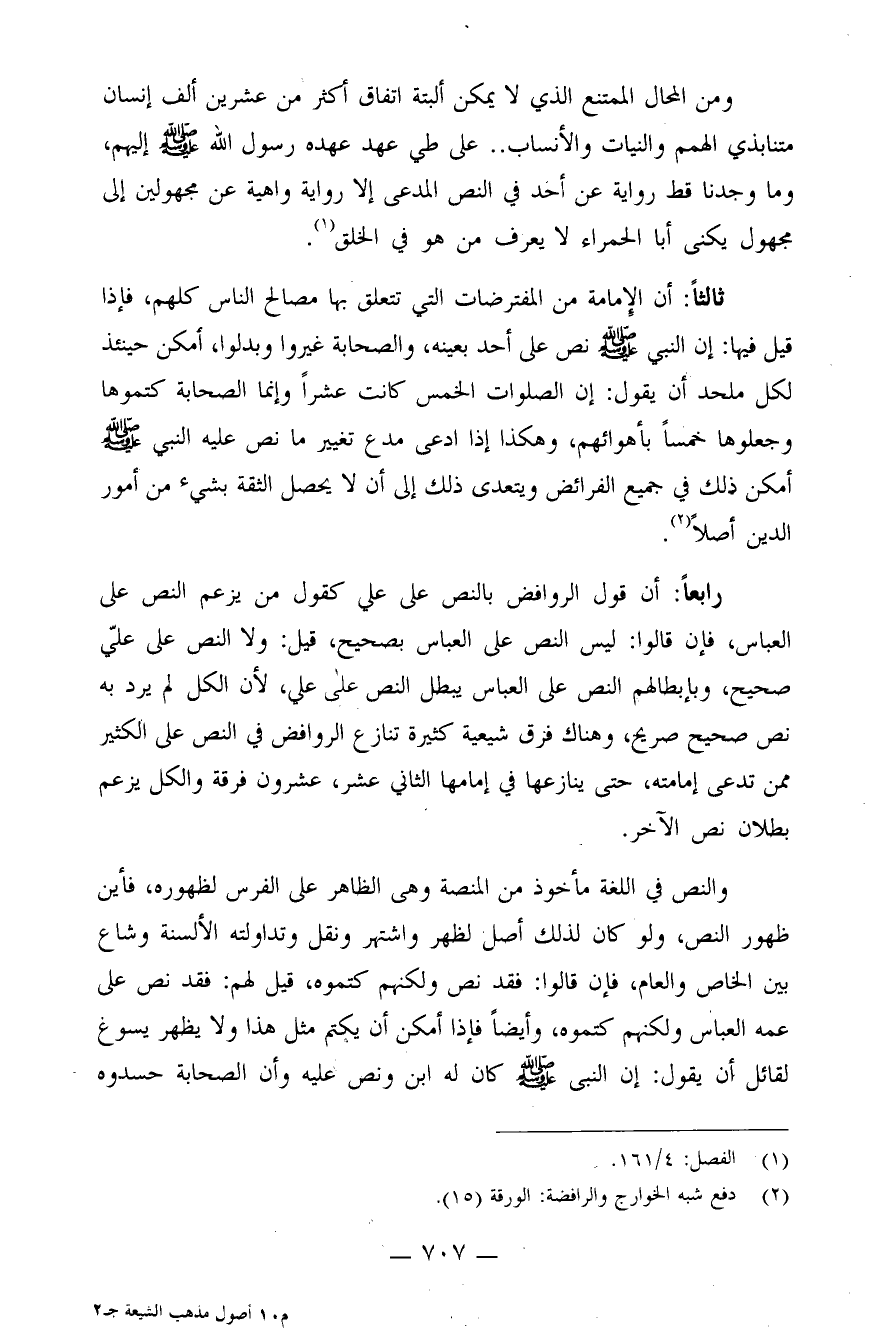 والنص في اللغة مأخوذ من المنصة وهي الظاهر على الفرس لظهوره، فأين ظهور النص، ولو كان لذلك أصل لظهر واشتهر ونقل وتداولته الألسنة وشاع بين الخاص والعام، فإن قالوا: فقد نص ولكنهم كتموه، قيل لهم: فقد نص على عمه العباس ولكنهم كتموه، وأيضًا فإذا أمكن أن يكتم مثل هذا ولا يظهر يسوغ لقائل أن يقول: إن النبي صلى الله عليه وسلم كان له ابن ونص عليه وأن الصحابة حسدوه