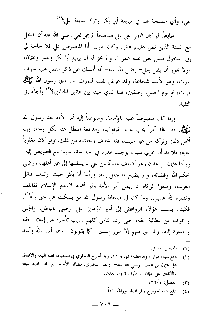 سابعًا: لو كان النّصّ على عليّ صحيحًا لم يجز لعليّ رضي الله عنه أن يدخل مع السّتّة الذي نصّ عليهم عمر، وكان يقول: أنا المنصوص عليّ فلا حاجة لي إلى الدّخول فيمن نصّ عليه عمر (¬2) ، ولم يجز له أن يبايع أبا بكر وعمر وعثمان، ولا يجوز أن يظنّ بعليّ - رضي الله عنه - أنّه أمسك عن ذكر النّصّ عليه خوف الموت، وهو الأسد شجاعة، وقد عرض نفسه للموت بين يدي رسول الله صلى الله عليه وسلم مرّات، ثم يوم الجمل، وصفّين، فما الذي جبنه بين هاتين الحالتين؟ (¬3) . وألجأه إلى التّقية.