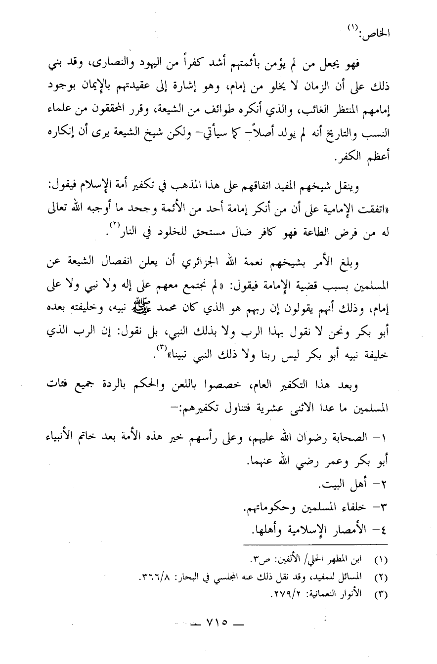 وينقل شيخهم المفيد اتفاقهم على هذا المذهب في تكفير أمة الإسلام فيقول: "اتّفقت الإماميّة على أنّ من أنكر إمامة أحد من الأئمّة وجحد ما أوجبه الله تعالى له من فرض الطّاعة فهو كافر ضالّ مُستحقّ للخلود في النّار" (¬2) .