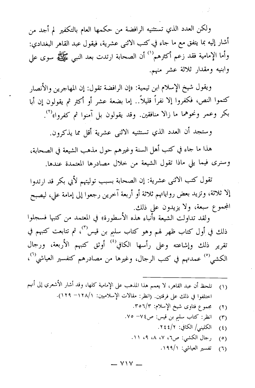 ويقول شيخ الإسلام ابن تيمية: "إن الرافضة تقول: إن المهاجرين والأنصار كتموا النص، فكفروا إلا نفرًا قليلاً.. إما بضعة عشر أو أكثر، ثم يقولون: إن أبا بكر وعمر ونحوهما مازالا منافقين. وقد يقولون: بل آمنوا ثم كفروا" (¬2) .