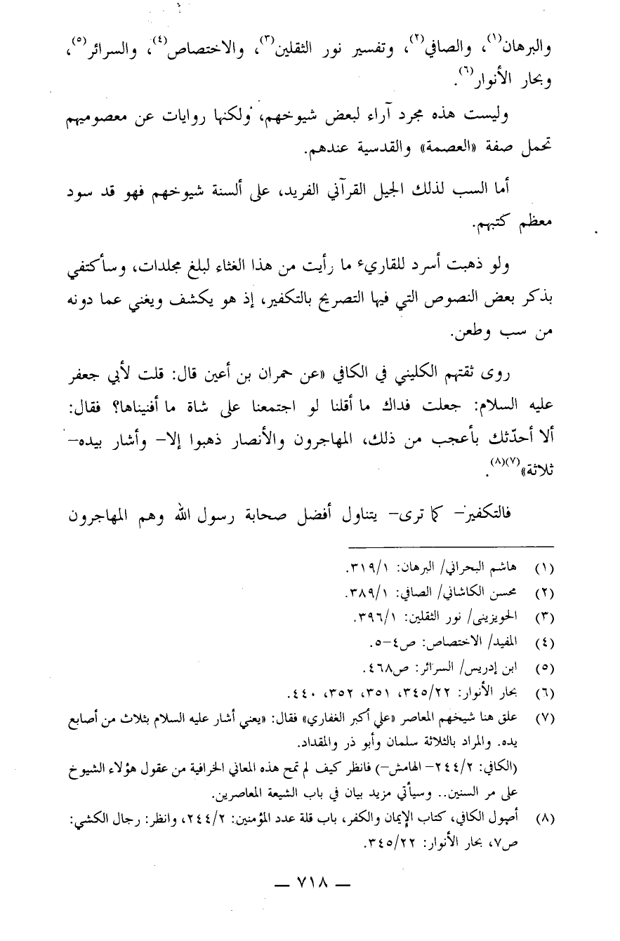 (¬7) علّق هنا شيخهم المعاصر "علي أكبر الغفاري" فقال: "يعني أشار عليه السّلام بثلاث من أصابع يده. والمراد بالثّلاثة سلمان وأبو ذرّ والمقداد". (الكافي: 2/244 - الهامش) . فانظر كيف لم تمح هذه المعاني الخرافيّة من عقول هؤلاء الشّيوخ على مرّ السّنين.. وسيأتي مزيد بيان في باب الشّيعة المعاصرين.