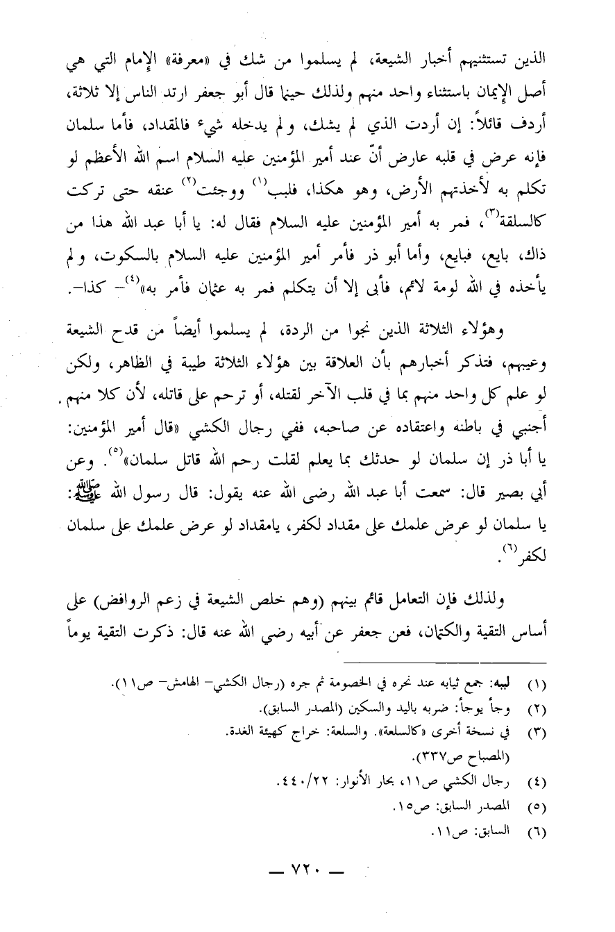 وهؤلاء الثلاثة الذين نجوا من الردة، لم يسلموا أيضًا من قدح الشيعة وعيبهم، فتذكر أخبارهم بأن العلاقة بين هؤلاء الثلاثة طيبة في الظاهر، ولكن لو علم كل واحد منهم بما في قلب الآخر لقتله، أو ترحم على قاتله؛ لأن كلاً منهم أجنبي في باطنه واعتقاده عن صاحبه، ففي رجال الكشي "قال أمير المؤمنين: يا أبا ذر، إن سلمان لو حدثك بما يعلم لقلت: رحم الله قاتل سلمان" (¬5) .