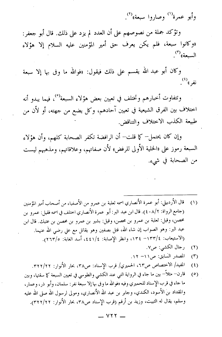 (¬5) قارن - مثلاً - بين ما جاء في الرواية التي عند الكشي والطوسي في تعيين السبعة كما سقتها، وبين ما جاء في قرب الإسناد للحميري وفيه: "فوالله ما وفى بها إلا سبعة نفر: سلمان، وأبو ذر، وعمار، والمقداد بن الأسود الكندي، وجابر بن عبد الله الأنصاري، ومولى لرسول الله صلى الله عليه وسلم، يقال له الثبيت، وزيد بن أرقم" (قرب الإسناد: ص38، بحار الأنوار: 22/322)