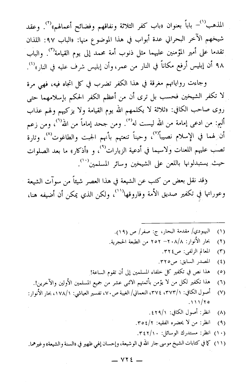 المذهب - (¬1) . - بابًا بعنوان "باب كفر الثّلاثة ونفاقهم وفضائح أعمالهم" (¬2) . وعقد شيخهم الآخر البحراني عدة أبواب في هذا الموضوع منها: "الباب 97: اللّذان تقدّما على أمير المؤمنين عليهما مثل ذنوب أمّة محمّد إلى يوم القيامة (¬3) . والباب 98 أن إبليس أرفع مكانًا في النار من عمر، وأن إبليس شرف عليه في النار» (¬4) .
