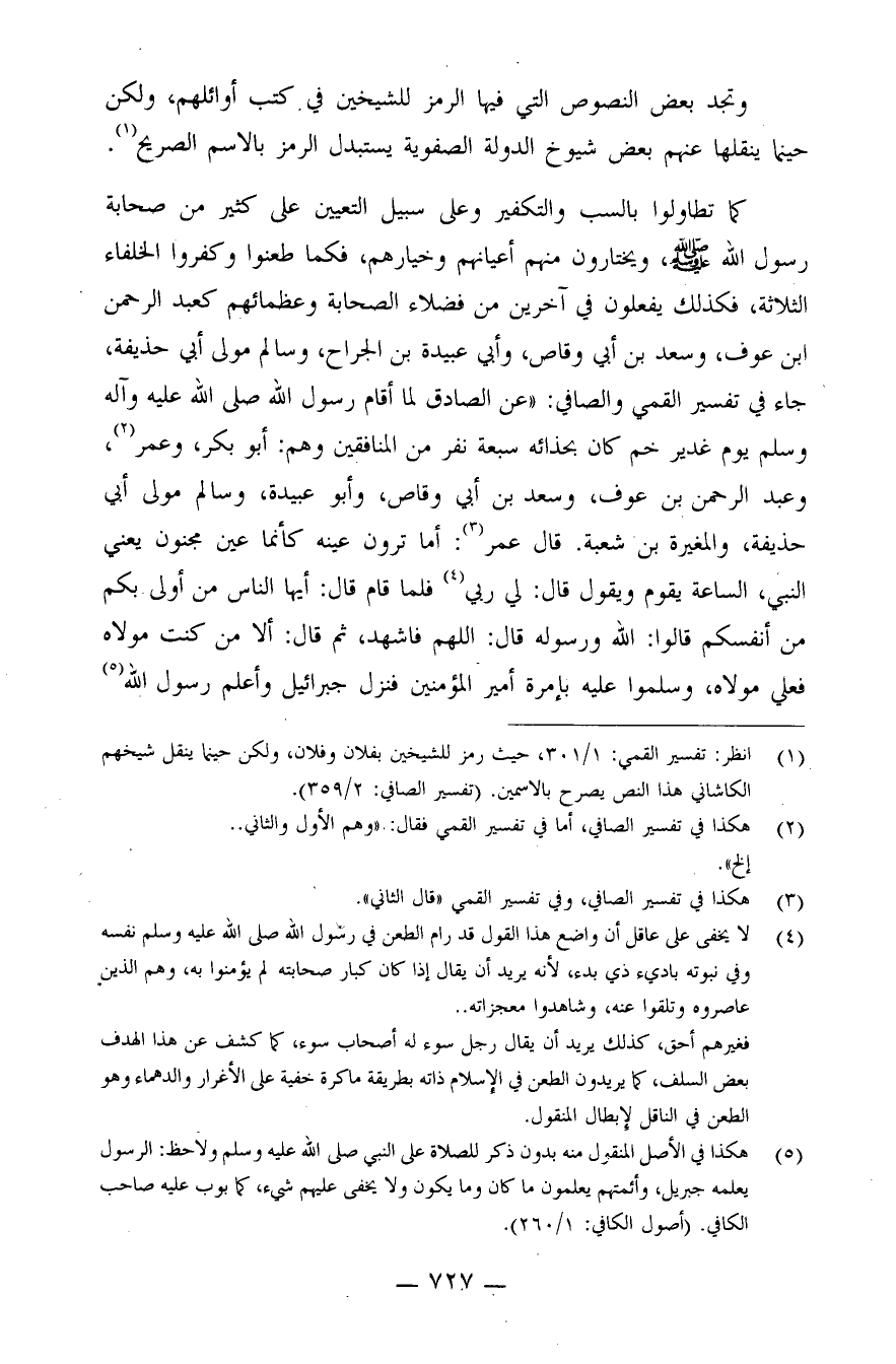 كما تطاولوا بالسب والتكفير، وعلى سبيل التعيين على كثير من صحابة رسول الله صلى الله عليه وسلم، ويختارون منهم أعيانهم وخيارهم، فكما طعنوا وكفروا الخلفاء الثلاثة، فكذلك يفعلون في آخرين من فضلاء الصحابة وعظمائهم كعبد الرحمن بن عوف، وسعد بن أبي وقاص، وأبي عبيدة بن الجراح، وسالم مولى أبي حذيفة، جاء في تفسير القمي والصافي: "عن الصادق: لما أقام رسول الله صلى الله عليه وسلم يوم غدير خم كان بحذائه سبعة نفر من المنافقين وهم: أبو بكر، وعمر (¬2) ، وعبد الرحمن بن عوف، وسعد بن أبي وقاص، وأبو عبيدة، وسالم مولى أبي حذيفة، والمغيرة بن شعبة. قال عمر (¬3) .: أما ترون عينه كأنما عين مجنون يعني النبي، الساعة يقوم ويقول: قال لي ربي (¬4) . فلما قام قال: أيها الناس من أولى بكم من أنفسكم؟ قالوا: الله ورسوله. قال: اللهم فاشهد، ثم قال: ألا من كنت مولاه فعلي مولاه، وسلموا عليه بإمرة أمير المؤمنين فنزل جبرائيل وأعلم رسول الله (¬5) .