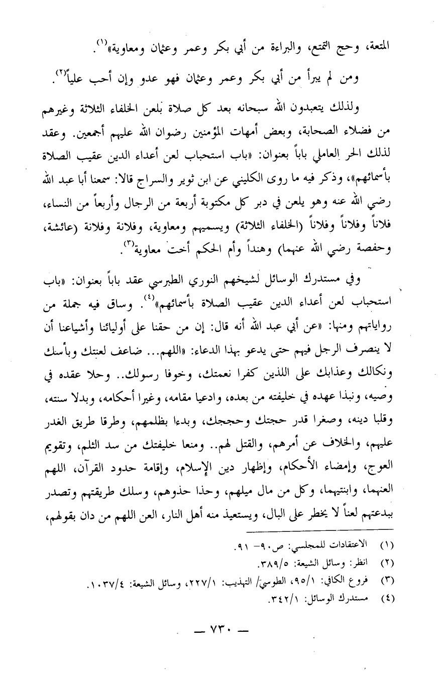 ولذلك يتعبّدون الله سبحانه بعد كلّ صلاة بلعن الخلفاء الثّلاثة وغيرهم من فضلاء الصّحابة، وبعض أمّهات المؤمنين رضوان الله عليهم أجمعين. وعقد لذلك الحرّ العاملي بابًا بعنوان: "باب استحباب لعن أعداء الدّين عقيب الصّلاة بأسمائهم"، وذكر فيه ما روى الكليني عن ابن ثوير والسّراج قالا: سمعنا أبا عبد الله رضي الله عنه وهو يلعن في دبر كلّ مكتوبة أربعة من الرّجال وأربعًا من النّساء، فلانًا وفلانًا وفلانًا (الخلفاء الثّلاثة) ويسمّيهم ومعاوية، وفلانة وفلانة (عائشة، وحفصة رضي الله عنهما) وهندًا وأمّ الحكم أخت معاوية (¬3) .