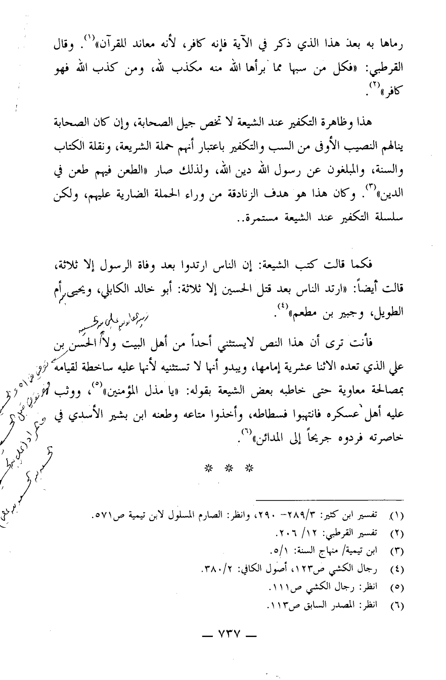 هذا وظاهرة التكفير عند الشيعة لا تخص جيل الصحابة، وإن كان الصحابة ينالهم النصيب الأوفى من السب والتكفير باعتبار أنهم حملة الشريعة، ونقلة الكتاب والسنة، والمبلغون عن رسول الله دين الله، ولذلك صار "الطعن فيهم طعن في الدين" (¬3) . وكان هذا هو هدف الزنادقة من وراء الحملة الضارية عليهم، ولكن سلسلة التكفير عند الشيعة مستمرة.