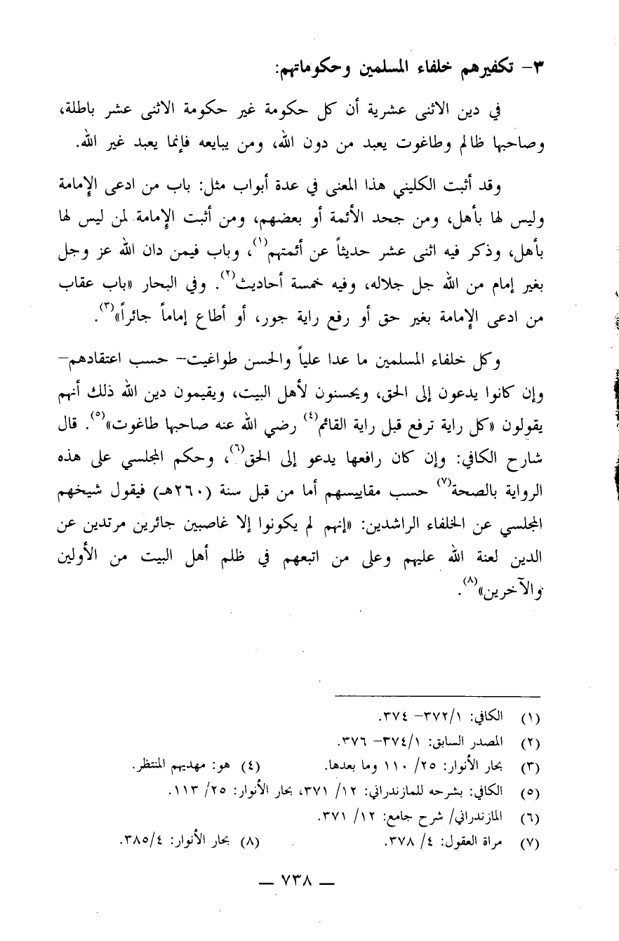 وكل خلفاء المسلمين ما عدا عليًا والحسن طواغيت - حسب اعتقادهم - وإن كانوا يدعون إلى الحق، ويحسنون لأهل البيت، ويقيمون دين الله، ذلك أنهم يقولون: "كل راية ترفع قبل راية القائم (¬4) . رضي الله عنه صاحبها طاغوت" (¬5) . قال شارح الكافي: "وإن كان رافعها يدعو إلى الحق" (¬6) ، وحكم المجلسي على هذه الرواية بالصحة (¬7) . حسب مقاييسهم.