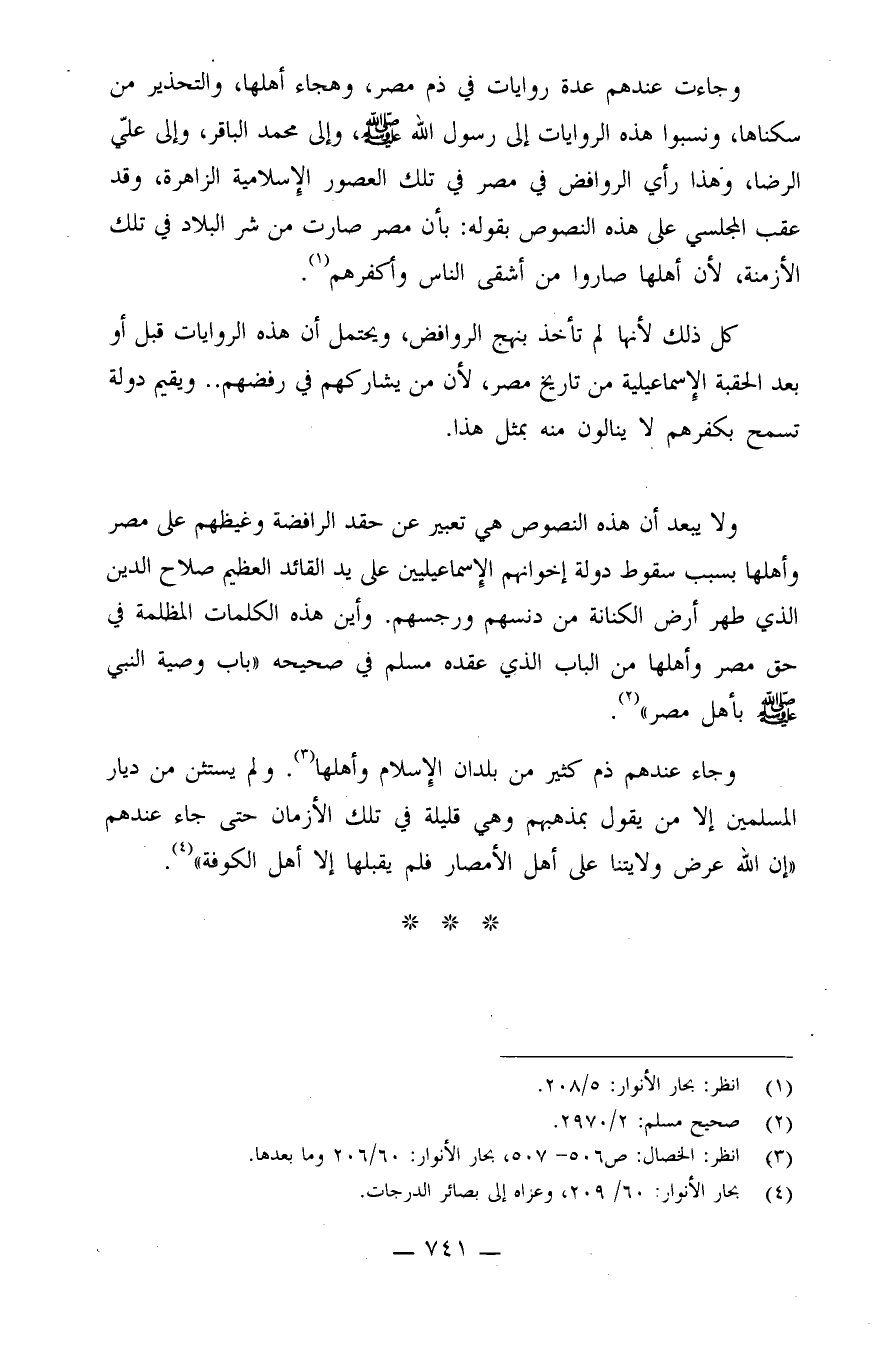 وجاءت عندهم عدة روايات في ذم مصر، وهجاء أهلها، والتحذير من سكناها، ونسبوا هذه الروايات إلى رسول الله صلى الله عليه وسلم، وإلى محمد الباقر، وإلى علي الرضا، وهذا رأي الروافض في مصر في تلك العصور الإسلامية الزاهرة، وقد عقب المجلسي على هذه النصوص بقوله بأن مصر صارت من شر البلاد في تلك الأزمنة، لأن أهلها صاروا من أشقى الناس وأكفرهم (¬1) .