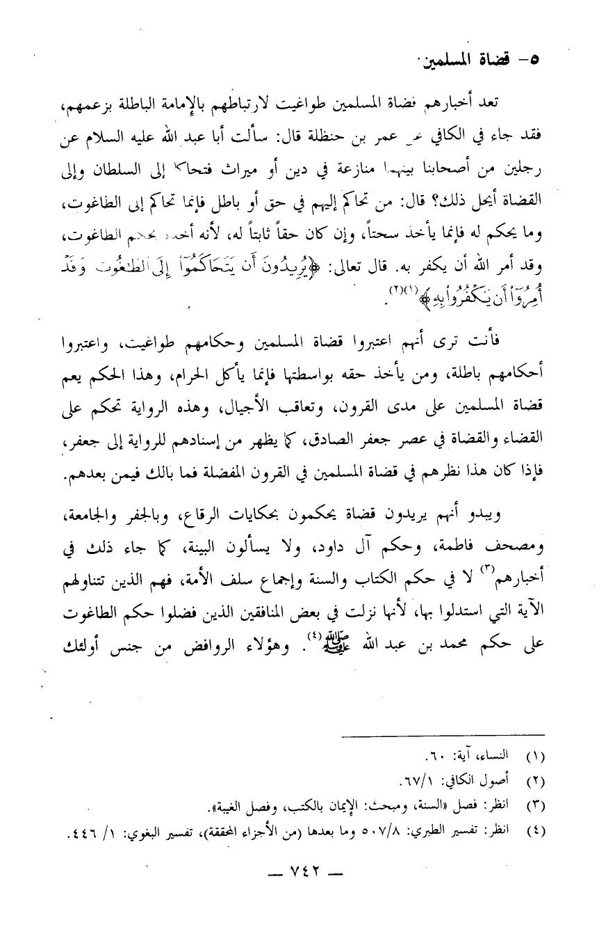 فأنت ترى أنهم اعتبروا قضاة المسلمين وحكامهم طواغيت، واعتبروا أحكامهم باطلة، ومن يأخذ حقه بواسطتها فإنما يأكل الحرام، وهذا الحكم يعم قضاة المسلمين على مدى القرون وتعاقب الأجيال، وهذه الرواية تحكم على القضاء والقضاة في عصر جعفر الصادق، كما يظهر من إسنادهم للرواية إلى جعفر، فإذا كان هذا نظرهم في قضاة المسلمين في القرون المفضلة فما بالك فيمن بعدهم.