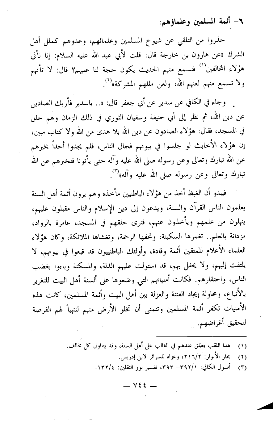 حذروا من التلقي عن شيوخ المسلمين وعلمائهم، وعدوهم كملل أهل الشرك "عن هارون بن خارجة قال: قلت لأبي عبد الله عليه السّلام: إنّا نأتي هؤلاء المخالفين (¬1) . فنسمع منهم الحديث يكون حجّة لنا عليهم؟ قال: لا تأتهم ولا تسمع منهم، لعنهم الله ولعن مللهم المشركة" (¬2) .