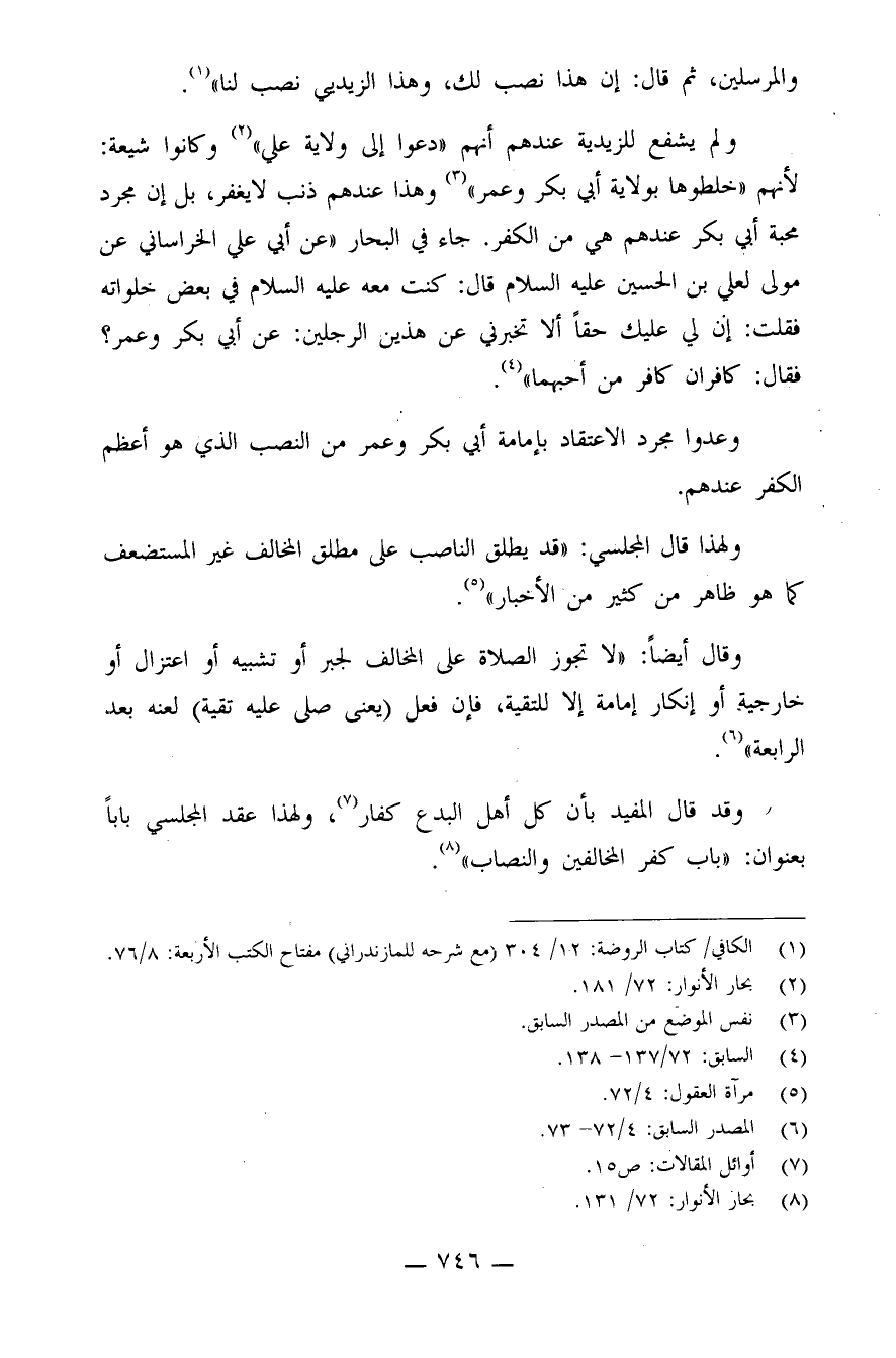 وقد قال المفيد بأن كل أهل البدع كفار (¬7) ، ولهذا عقد المجلسي بابًا بعنوان: "باب كفر المخالفين والنصاب" (¬8) .