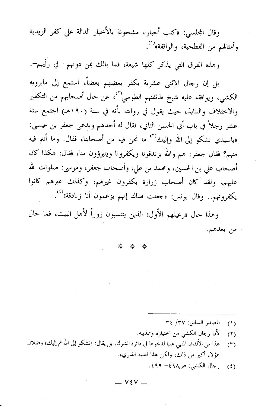 وقال المجلسي: "كتب أخبارنا مشحونة بالأخبار الدالة على كفر الزيدية وأمثالهم من الفطحية، والواقفة" (¬1) .