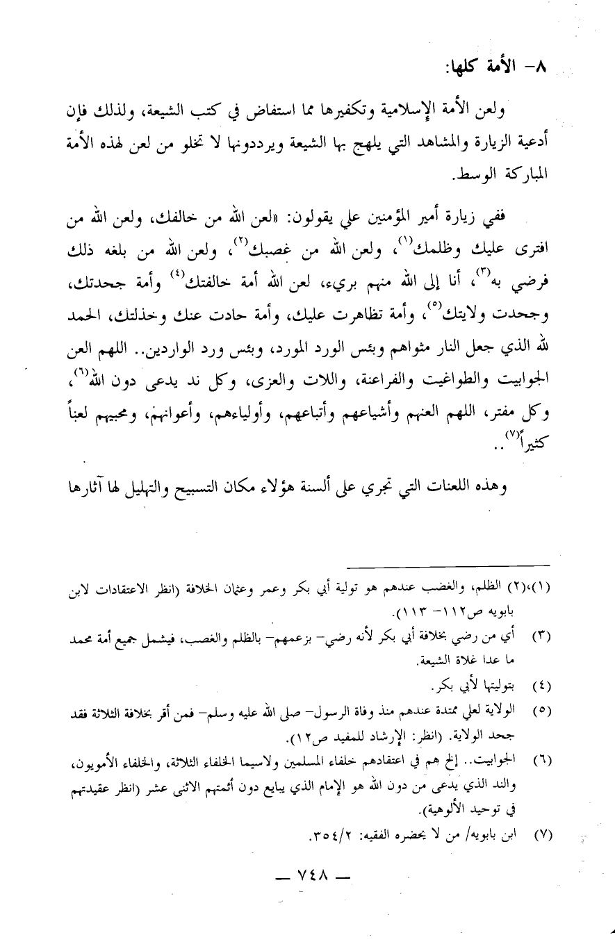 ولعن الأمة الإسلامية وتكفيرها مما استفاض في كتب الشيعة، ولذلك فإن أدعية الزيارة والمشاهد التي يلهج بها الشيعة ويرددونها لا تخلو من لعن لهذه الأمة المباركة الوسط.