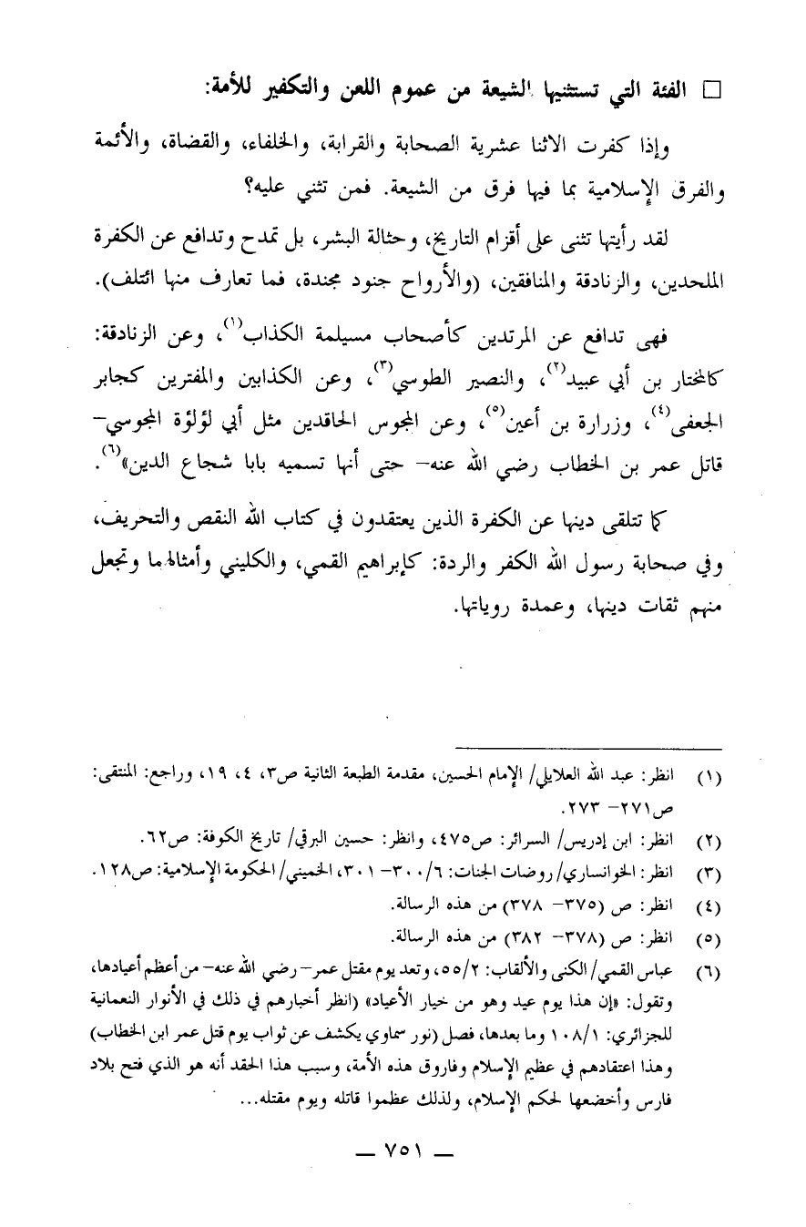 (¬6) عباس القمي/ الكنى والألقاب: 2/55، وتعد يوم مقتل عمر رضي الله عنه من أعظم أعيادها، وتقول: "إن هذا يوم عيد وهو من خيار الأعياد" انظر أخبارهم في ذلك في الأنوار النعمانية للجزائري: 1/108 وما بعدها، فصل "نور سماوي يكشف عن ثواب يوم قتل عمر بن الخطاب"، وهذا اعتقادهم في عظيم الإسلام وفاروق هذه الأمة، وسبب هذا الحق أنه هو الذي فتح بلاد فارس وأخضعها لحكم الإسلام، ولذلك عظموا قاتله ويوم مقتله