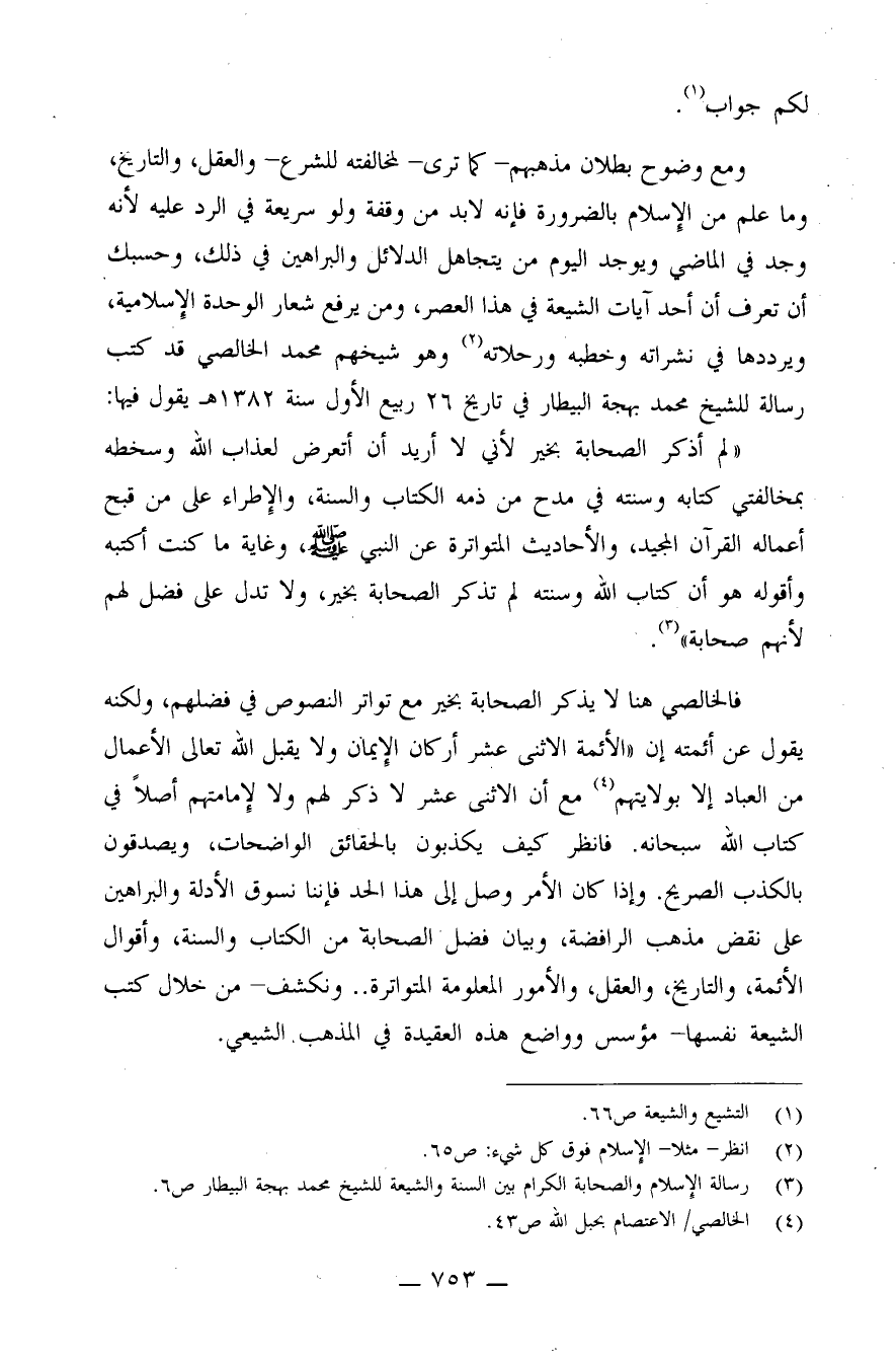 ومع وضوح بطلان مذهبهم - كما ترى - لمخالفته للشرع والعقل والتاريخ، وما علم من الإسلام بالضرورة، فإنه لابد من وقفة ولو سريعة في الرد عليه؛ لأنه وجد في الماضي ويوجد اليوم من يتجاهل الدلائل والبراهين في ذلك، وحسبك أن تعرف أن أحد آيات الشيعة في هذا العصر، ومن يرفع شعار الوحدة الإسلامية، ويرددها في نشراته وخطبه ورحلاته (¬2) . وهو شيخهم محمد الخالصي قد كتب رسالة للشيخ محمد بهجة البيطار في تاريخ 26 ربيع الأول سنة 1382هـيقول فيها: