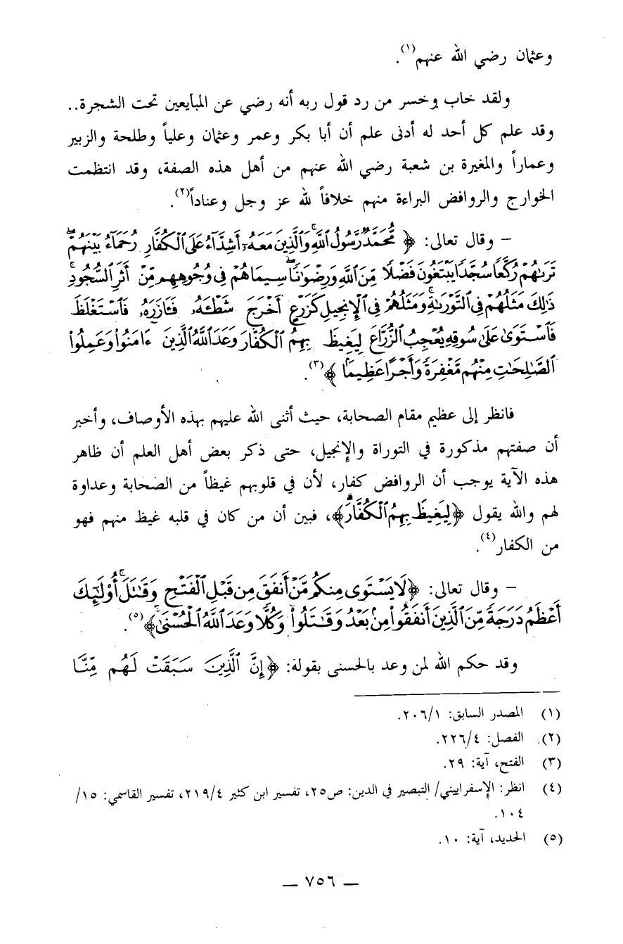فانظر إلى عظيم مقام الصحابة، حيث أثنى الله عليهم بهذه الأوصاف، وأخبر أن صفتهم مذكورة في التوراة والإنجيل، حتى ذكر بعض أهل العلم أنّ ظاهر هذه الآية يُوجب أنّ الرّوافض كفّار؛ لأنّ في قلوبهم غيظًا من الصّحابة وعداوة لهم، والله يقول: {لِيَغِيظَ بِهِمُ الْكُفَّارَ} ، فبيّن أنّ من كان في قلبه غيظ منهم فهو من الكفّار (¬4) .