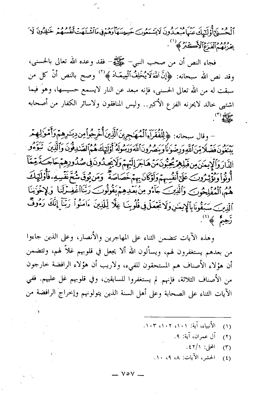 ولا ريب أن هؤلاء الرّافضة خارجون من الأصناف الثلاثة، فإنهم لم يستغفروا للسّابقين، وفي قلوبهم غلّ عليهم. ففي الآيات الثناء على الصحابة وعلى أهل السنة الذين يتولونهم وإخراج الرافضة من