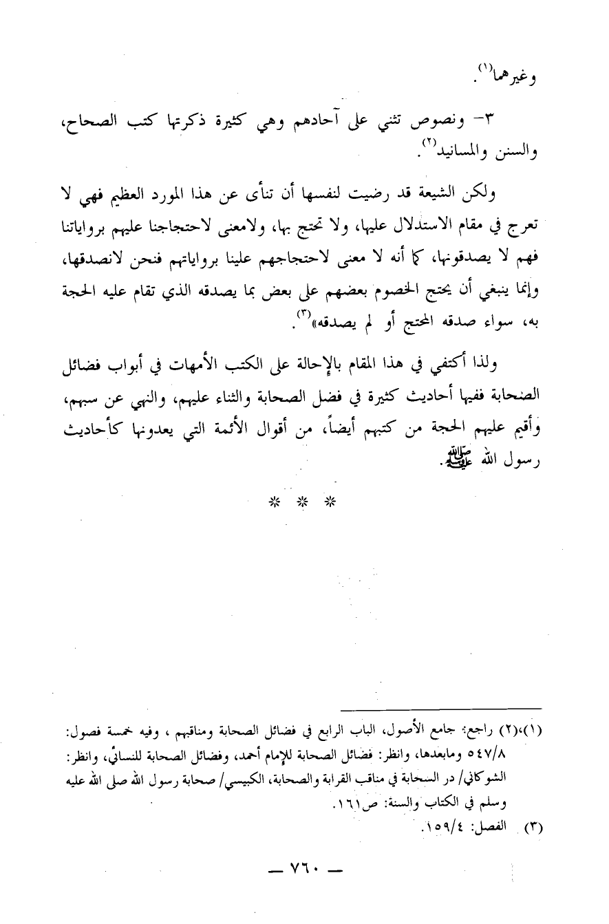 ولذا أكتفي في هذا المقام بالإحالة على الكتب الأمهات في أبواب فضائل الصحابة؛ ففيها أحاديث كثيرة في فضل الصحابة والثناء عليهم، والنهي عن سبهم وأقيم عليهم الحجة من كتبهم أيضًا، من أقوال الأئمة التي يعدونها كأحاديث رسول الله صلى الله عليه وسلم.