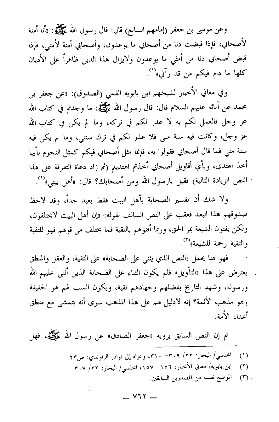 وفي معاني الأخبار لشيخهم ابن بابويه القمي (الصدوق) : "عن جعفر بن محمد عن آبائه عليه السلام قال: قال رسول الله صلى الله عليه وسلم: ما وجدتم في كتاب الله عز وجل فالعمل لكم به، لا عذر لكم في تركه، وما لم يكن في كتاب الله عز وجل، وكانت فيه سنة مني فلا عذر لكم في ترك سنتي، وما لم يكن فيه سنة مني فما قال أصحابي فقولوا به، فإنما مثل أصحابي فيكم كمثل النجوم بأيها أخذ اهتدي، وبأي أقاويل أصحابي أخذتم اهتديتم (ثم زاد دعاة التفرقة على هذا النص الزيادة التالية) فقيل: يا رسول الله، ومن أصحابك؟ قال: أهل بيتي" (¬2) .