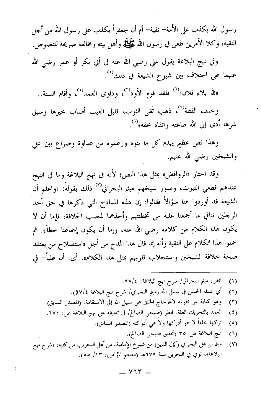 وقد احتار "الروافض" بمثل هذا النص؛ لأنه في نهج البلاغة وما في النهج عندهم قطعي الثبوت، وصور شيخهم ميثم البحراني (¬7) . ذلك بقوله: "واعلم أن الشيعة قد أوردوا هنا سؤالاً فقالوا: إن هذه الممادح التي ذكرها في حق أحد الرجلين تنافي ما أجمعنا عليه من تخطئتهم وأخذهما لمنصب الخلافة، فإما أن لا يكون هذا الكلام من كلامه رضي الله عنه، وإما أن يكون إجماعنا خطأ".