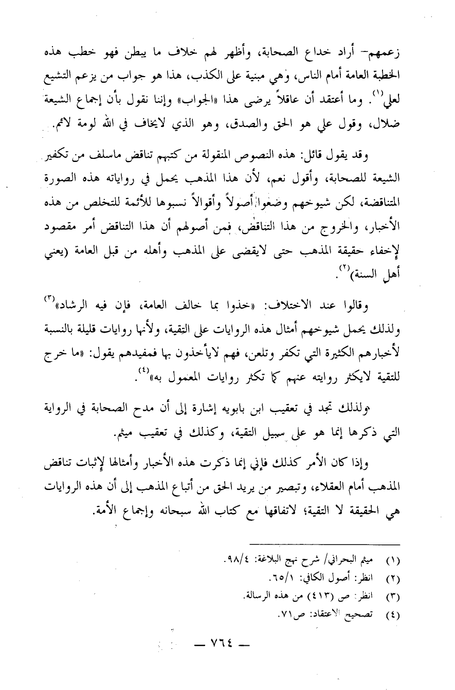 وإذا كان الأمر كذلك فإني إنما ذكرت هذه الأخبار وأمثالها لإثبات تناقض المذهب أمام العقلاء، وتبصير من يريد الحق من أتباع المذهب إلى أن هذه الروايات هي الحقيقة لا التقية؛ لاتفاقها مع كتاب الله سبحانه وإجماع الأمة.