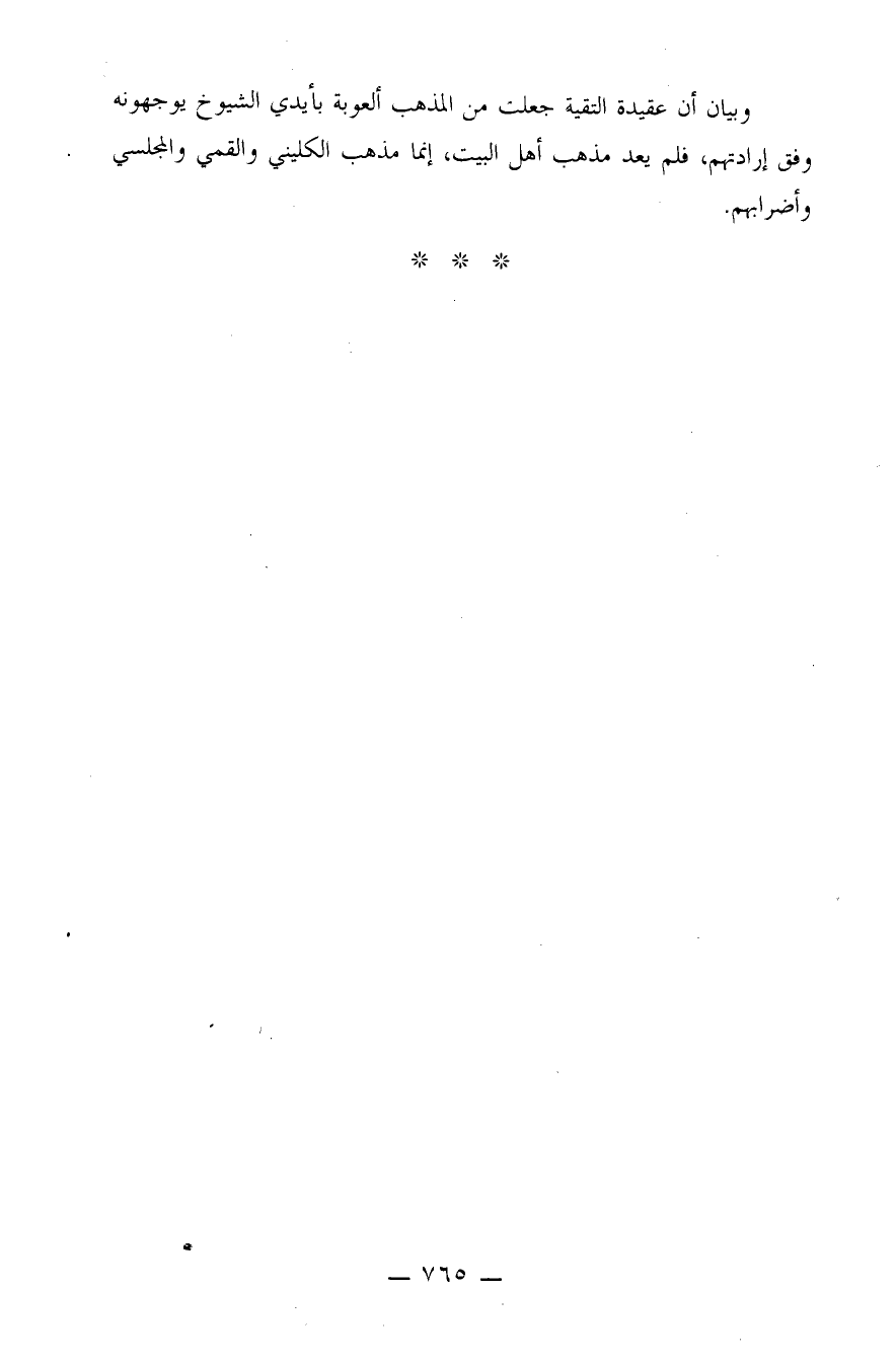 وبيان أن عقيدة التقية جعلت من المذهب ألعوبة بأيدي الشيوخ يوجهونه وفق إرادتهم، فلم يعد مذهب أهل البيت، إنما مذهب الكليني والقمي والمجلسي وأضرابهم.