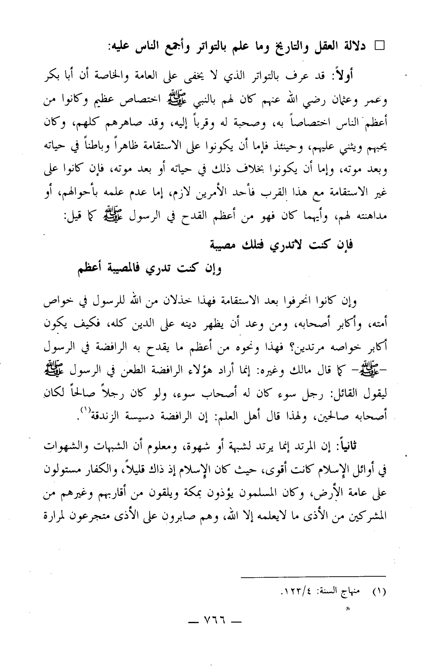 أولاً: قد عرف بالتواتر الذي لا يخفى على العامة والخاصة أن أبا بكر وعمر وعثمان رضي الله عنهم كان لهم بالنبي صلى الله عليه وسلم اختصاص عظيم وكانوا من أعظم الناس اختصاصًا به، وصحبة له وقربًا إليه، وقد صاهرهم كلهم، وكان يحبهم ويثني عليهم، وحينئذ فإما أن يكونوا على الاستقامة ظاهرًا وباطنًا في حياته وبعد موته، وإما أن يكونوا بخلاف ذلك في حياته أو بعد موته، فإن كانوا على غير الاستقامة مع هذا القرب فأحد الأمرين لازم، إما عدم علمه بأحوالهم، أو مداهنته لهم، وأيهما كان فهو من أعظم القدح في الرسول صلى الله عليه وسلم كما قل:
