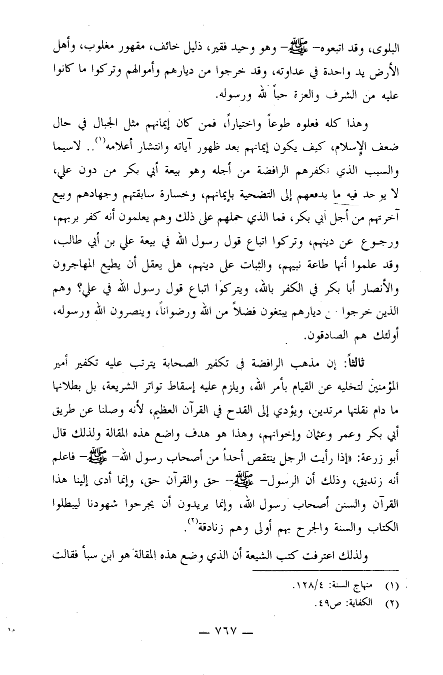 ثالثًا: إن مذهب الرافضة في تكفير الصحابة يترتب عليه تكفير أمير المؤمنين لتخليه عن القيام بأمر الله، ويلزم عليه إسقاط تواتر الشريعة، بل بطلانها ما دام نقلتها مرتدين، ويؤدي إلى القدح في القرآن العظيم، لأنه وصلنا عن طريق أبي بكر وعمر وعثمان وإخوانهم، وهذا هو هدف واضع هذه المقالة، ولذلك قال أبو زرعة: «إذا رأيت الرجل ينتقص أحدًا من أصحاب رسول الله صلى الله عليه وسلم فاعلم أنه زنديق، وذلك أن الرسول صلى الله عليه وسلم حق والقرآن حق، وإنا أدى إلينا هذا القرآن والسنن أصحاب رسول الله، وإنما يريدون أن يجرحوا شهودنا ليبطلوا الكتاب والسنة، والجرح بهم أولى وهم زنادقة" (¬2) .