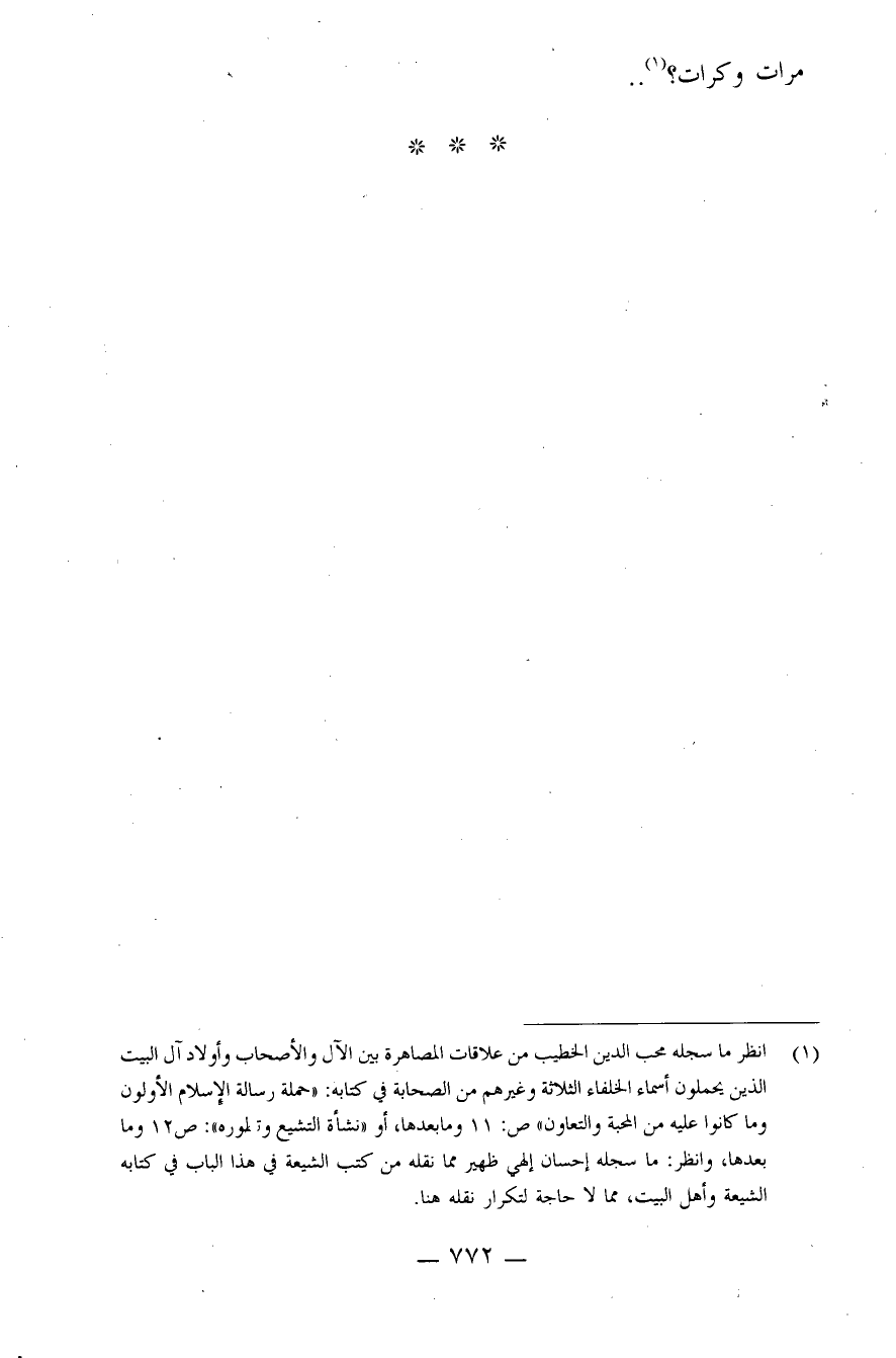 (¬1) انظر ما سجّله محبّ الدّين الخطيب من علاقات المصاهرة بين الآل والأصحاب وأولاد آل البيت الذين يحملون أسماء الخلفاء الثّلاثة وغيرهم من الصّحابة في كتابه: "حملة رسالة الإسلام الأوّلون وما كانوا عليه من المحبّة والتّعاون" ص:11 وما بعدها، أو "نشأة التّشيّع وتطوّره": ص12 وما بعدها، وانظر: ما سجّله إحسان إلهي ظهير ممّا نقله من كتب الشّيعة في هذا الباب في كتابه "الشّيعة وأهل البيت"، ممّا لا حاجة لتكرار نقله هنا