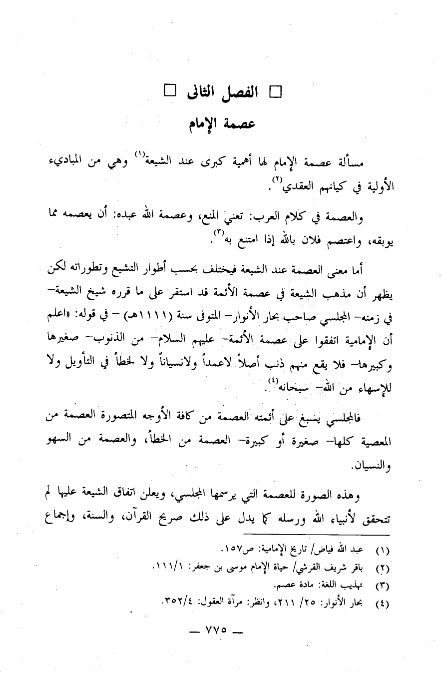 فالمجلسي يسبغ على أئمته العصمة من كافة الأوجه المتصورة: العصمة من المعصية كلها - صغيرة أو كبيرة - العصمة من الخطأ، والعصمة من السهو والنسيان.