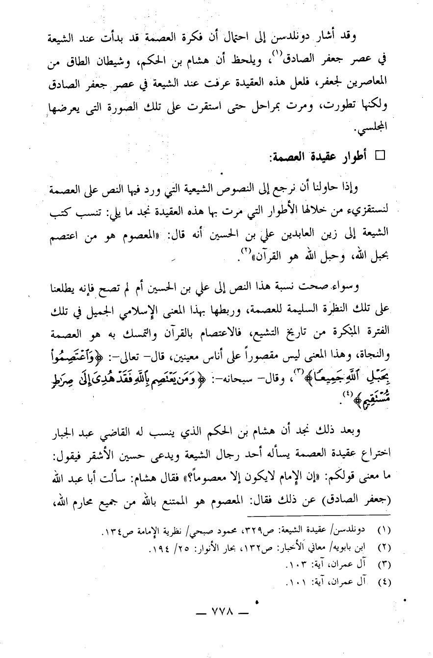 وقد أشار دونلدسن إلى احتمال أن فكرة العصمة قد بدأت عند الشيعة في عصر جعفر الصادق (¬1) ، ويلحظ أن هشام بن الحكم، وشيطان الطاق من المعاصرين لجعفر، فلعل هذه العقيدة عرفت عند الشيعة في عصر جعفر الصادق، ولكنها تطورت، ومرت بمراحل حتى استقرت على تلك الصورة التي يعرضها المجلسي.