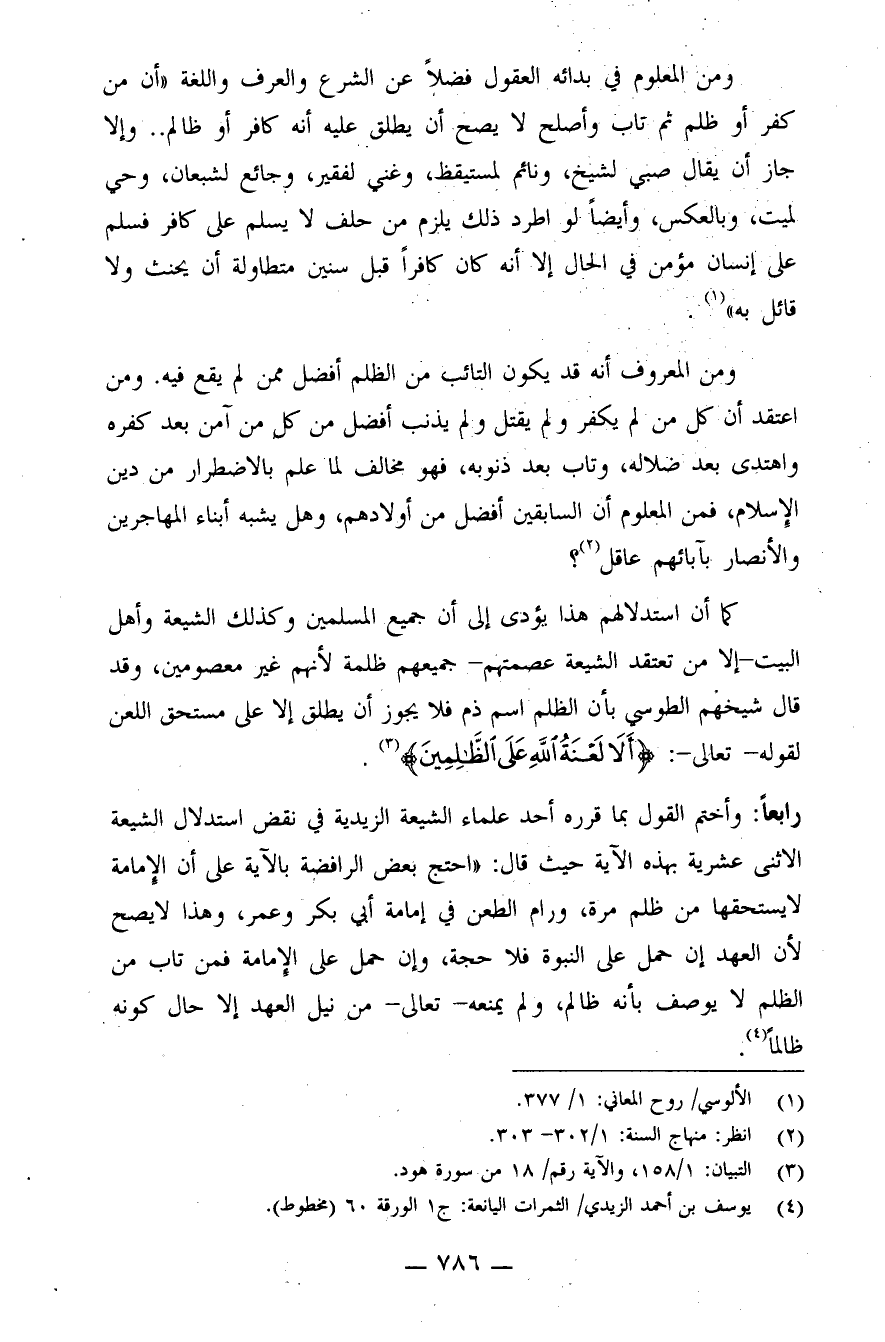 كما أن استدلالهم هذا يؤدي إلى أن جميع المسلمين وكذلك الشيعة وأهل البيت - إلا من تعتقد الشيعة عصمتهم - جميعهم ظلمة لأنهم غير معصومين، وقد قال شيخهم الطوسي بأن الظّلم اسم ذمّ فلا يجوز أن يطلق إلا على مستحقّ اللّعن لقوله - تعالى -: {أَلاَ لَعْنَةُ اللهِ عَلَى الظَّالِمِينَ} (¬3) .
