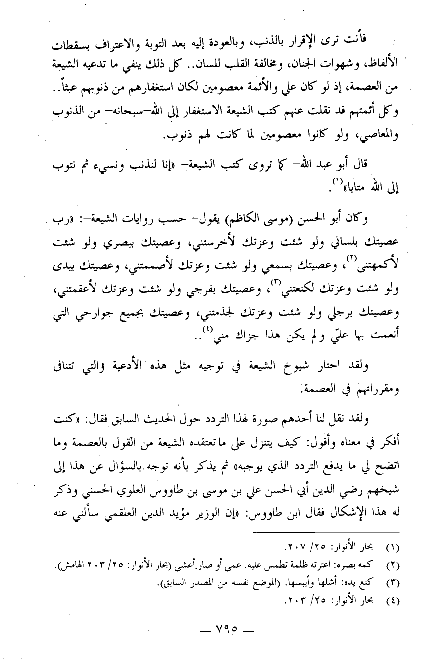 فأنت ترى الإقرار بالذنب، وبالعودة إليه بعد التوبة، والاعتراف بسقطات الألفاظ وشهوات الجنان، ومخالفة القلب للسان.. كل ذلك ينفي ما تدعيه الشيعة من العصمة، إذ لو كان علي والأئمة معصومين لكان استغفارهم من ذنوبهم عبثًا.. وكل أئمتهم قد نقلت عنهم كتب الشيعة الاستغفار إلى الله - سبحانه - من الذنوب والمعاصي، ولو كانوا معصومين لما كانت لهم ذنوب.