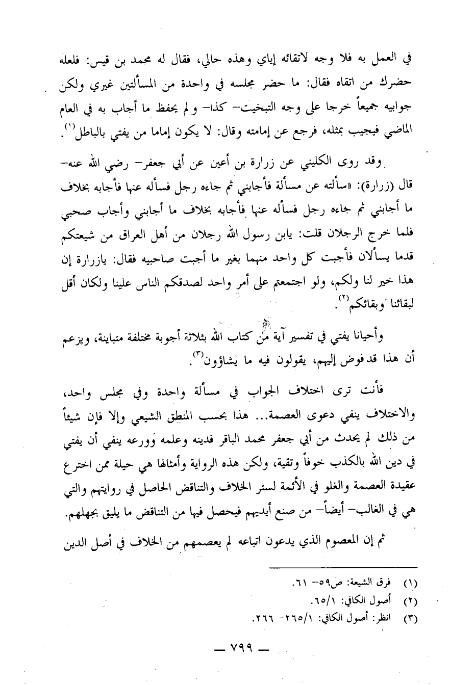 فأنت ترى اختلاف الجواب في مسألة واحدة وفي مجلس واحد، والاختلاف ينفي دعوى العصمة.. هذا بحسب المنطق الشيعي، وإلا فإن شيئًا من ذلك لم يحدث من أبي جعفر محمد الباقر، فدينه وعلمه وورعه ينفي أن يفتي في دين الله بالكذب خوفًا وتقية، ولكن هذه الرواية وأمثالها هي حيلة ممن اخترع عقيدة العصمة والغلو في الأئمة لستر الخلاف والتناقص الحاصل في روايتهم والتي هي في الغالب - أيضًا - من صنع أيديهم، فيحصل فيها من التناقض ما يليق بجهلهم.