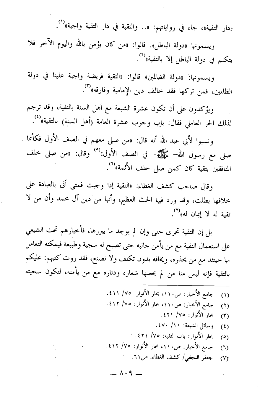 وقال صاحب كشف الغطاء: "التقية إذا وجبت فمتى أتي بالعبادة على خلافها بطلت، وقد ورد فيها الحث العظيم، وأنها من دين آل محمد، ومن لا تقية له لا إيمان له" (¬7) .