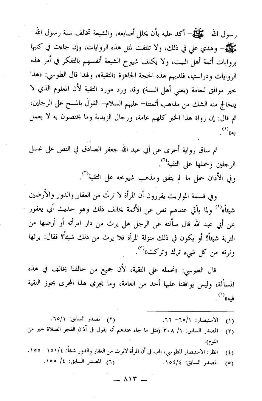 رسول الله صلى الله عليه وسلم أكد عليه بأن يخلل أصابعه، والشيعة تخالف سنة رسول الله صلى الله عليه وسلم وهدي علي في ذلك، ولا تلتفت لمثل هذه الروايات، وإن جاءت في كتبها بروايات أئمة أهل البيت، ولا يكلف شيوخ الشيعة أنفسهم بالتفكر في أمر هذه الروايات ودراستها، فلديهم هذه الحجة الجاهزة "التقية"، ولهذا قال الطوسي: "هذا خبر موافق للعامة (يعني أهل السنة) وقد ورد مورد التقية لأن المعلوم الذي لا يتخالج منه الشك من مذاهب أئمتنا - عليهم السلام - القول بالمسح على الرجلين، ثم قال: إن رواة هذا الخبر كلهم عامة، ورجال الزيدية، وما يختصون به لا يعمل به" (¬1) .