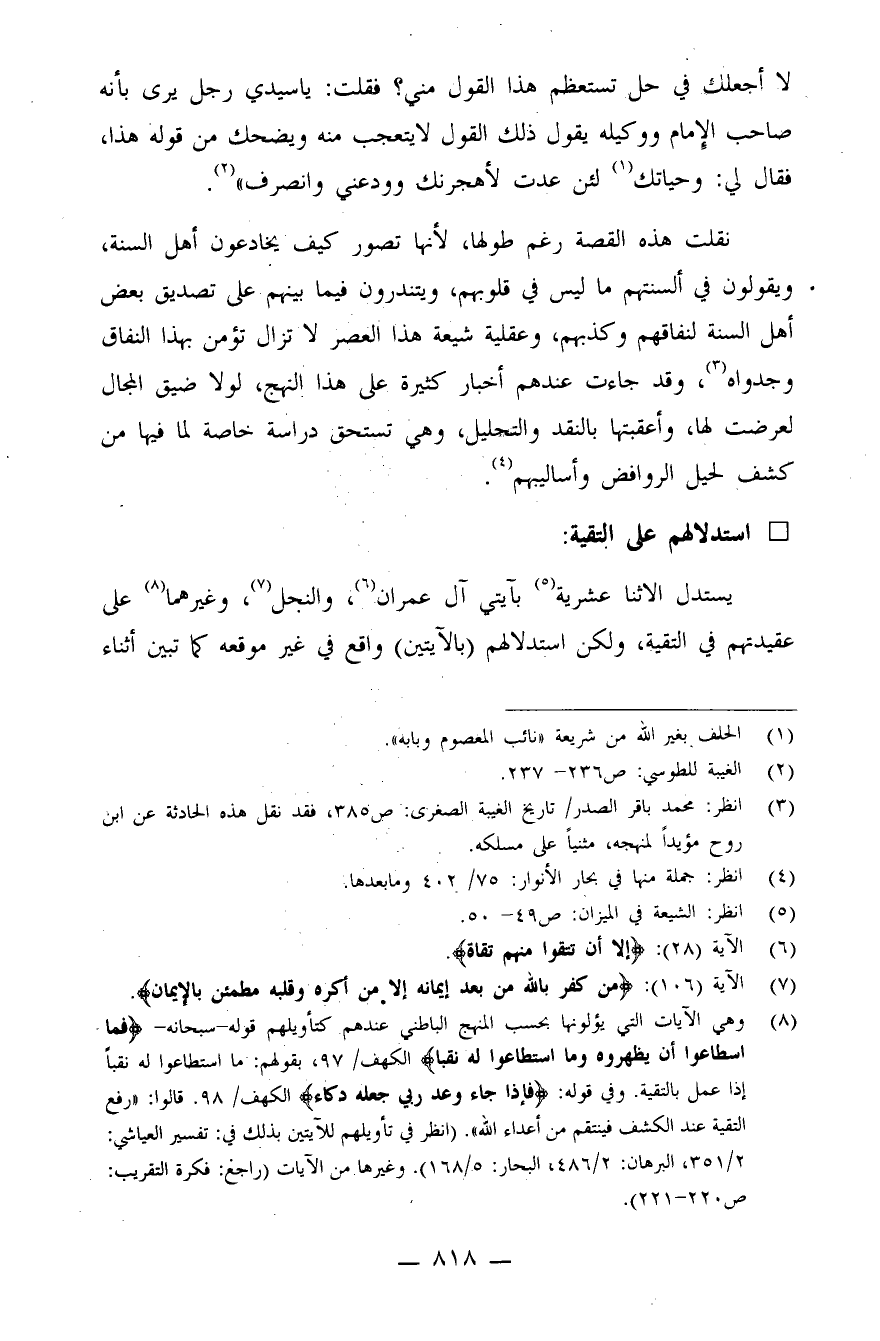 نقلت هذه القصة رغم طولها؛ لأنها تصور كيف يخادعون أهل السنة، ويقولون بألسنتهم ما ليس في قلوبهم، ويتندرون فيما بينهم على تصديق بعض أهل السنة لنفاقهم وكذبهم، وعقلية شيعة هذا العصر لا تزال تؤمن بهذا النفاق وجدواه (¬3) ، وقد جاءت عندهم أخبار كثيرة على هذا النهج، لولا ضيق المجال لعرضت لها، وأعقبتها بالنقد والتحليل، وهي تستحق دراسة خاصة لما فيها من كشف لحيل الروافض وأساليبهم (¬4) .