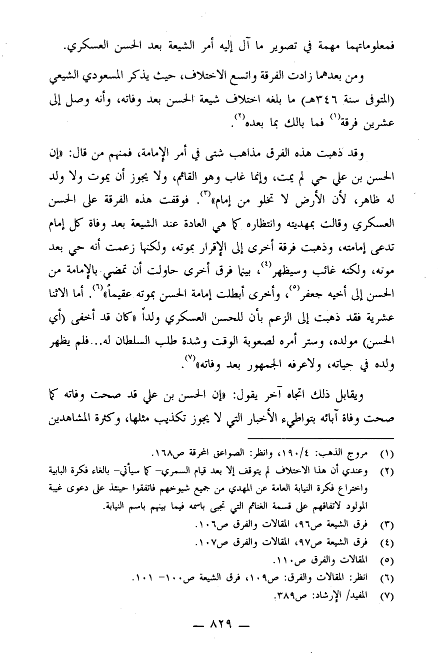 وقد ذهبت هذه الفرق مذاهب شتّى في أمر الإمامة، فمنهم من قال: "إنّ الحسن بن علي حيّ لم يمت، وإنّما غاب وهو القائم، ولا يجوز أن يموت ولا ولد له ظاهر، لأنّ الأرض لا تخلو من إمام" (¬3) . فوقفت هذه الفِرقة على الحسن العسكري وقالت بمهديته وانتظاره كما هي العادة عند الشّيعة بعد وفاة كلّ إمام تدّعي إمامته، وذهبت فرقة أخرى إلى الإقرار بموته، ولكنّها زعمت أنّه حيّ بعد موته، ولكنّه غائب وسيظهر (¬4) ، بينما فِرَق أخرى حاولت أن تمضي بالإمامة من الحسن إلى أخيه جعفر (¬5) ، وأخرى أبطلت إمامة الحسن بموته عقيمًا (¬6) .