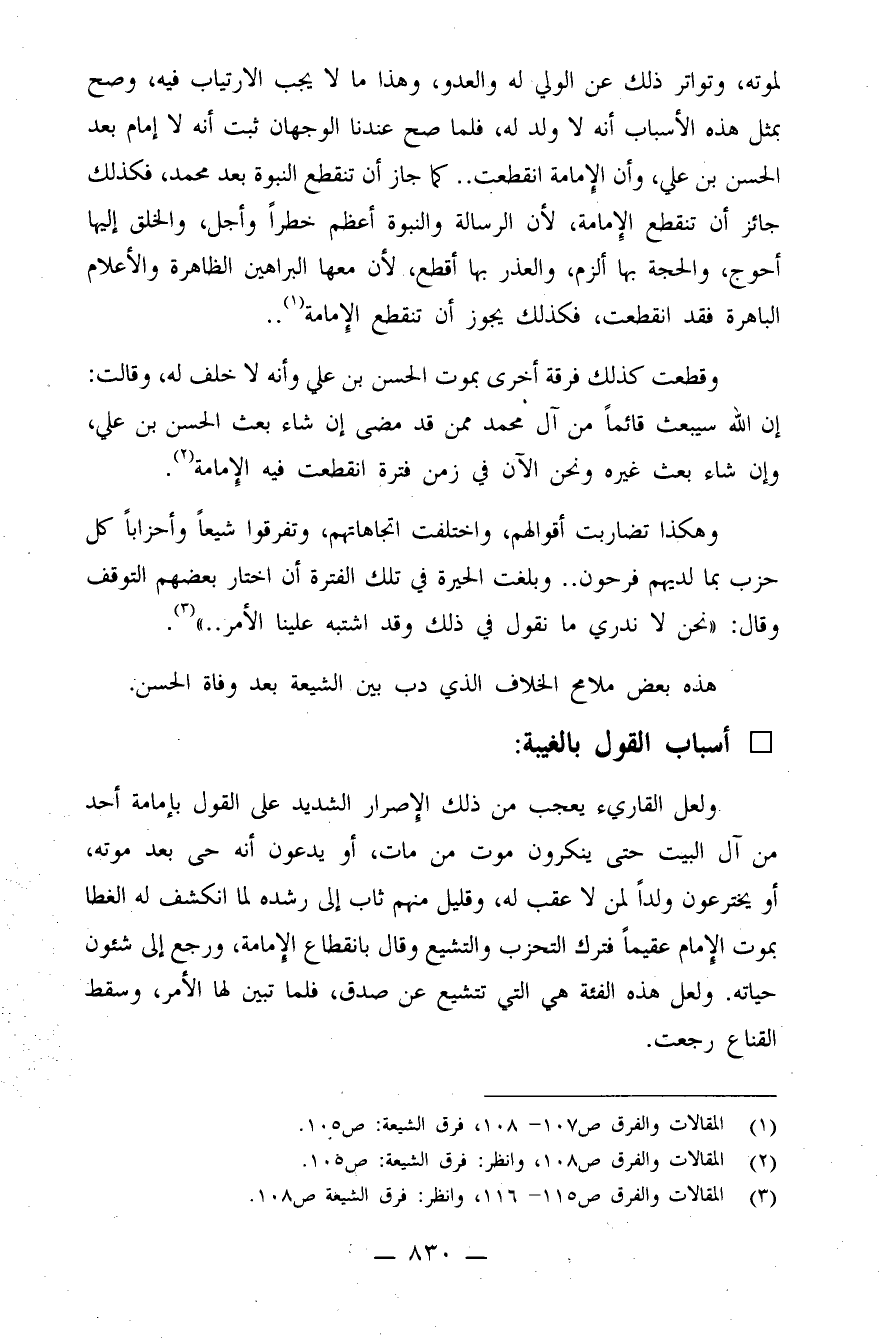 وقطعت كذلك فرقة أخرى بموت الحسن بن علي وأنه لا خلف له، وقالت: إن الله سيبعث قائمًا من آل محمد ممن قد مضى، إن شاء بعث الحسن بن علي، وإن شاء بعث غيره، ونحن الآن في زمن فترة انقطعت فيه الإمامة (¬2) .